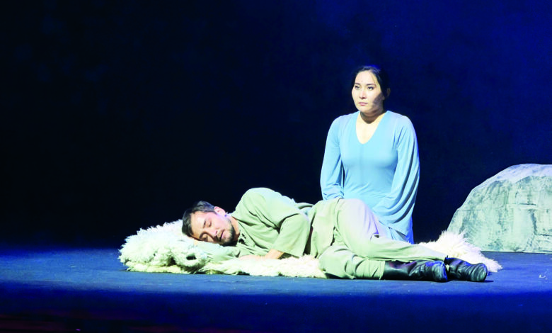 Ең әуелі айта кетерлігі, М.Жұмабаевтың тілінің құдіреттілігі, оны сахнадағы кейіпкерлер ойынын көрмей-ақ, көзді жұмып алып, жайбарақат отырып құлақпен жай ғана тыңдап та ләззат алатындай – тым көркем, кескінді. Міне, сол көркем тілдік қазынаны спектакльде кейіпкерлер бейнесін орындап жүрген әртістердің ойын барысында шебер бере білулері қандай әсерлі! Дауыстары қуатты, көрермен жүрегіне дөп тиіп, жанға жып-жылы, жұп-жұмсақ, жұп-жұмыр жетіп жатты.