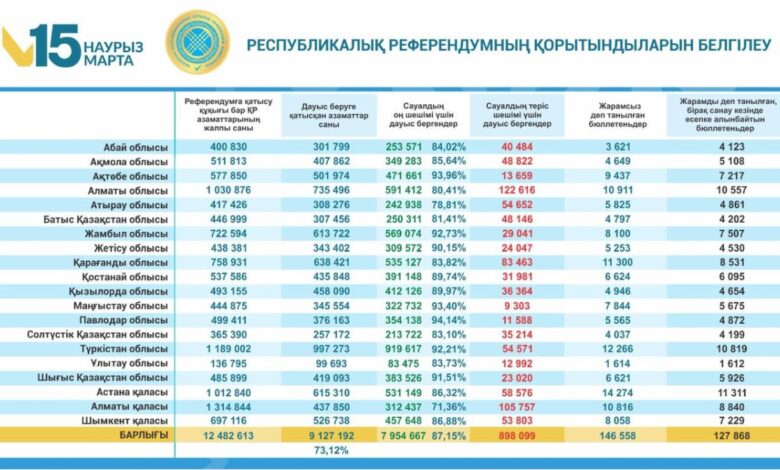 «Республикалық референдум туралы» Қазақстан Республикасы Конституциялық Заңының 31, 33-баптарына сәйкес және облыстардың, республикалық маңызы бар қалалардың және астананың аумақтық референдум комиссияларының ұсынған хаттамалары негізінде Қазақстан Республикасының Орталық референдум комиссиясы дауыс беру нәтижелері туралы хабарлайды: