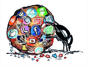 Аталған картинада қара қоңыз әлеуметтік желілердің логотиптерін домалатып бара жатады. Бұл – қазіргі адамның виртуалды әлемге тәуелділігінің метафорасы. Бұрын адам мал-мүлікке байланса, бүгінгі адам экранға байланды. Әлеуметтік желі – адамның уақытын, назарын, еркіндігін домалатып алып бара жатқан цифрлық «тезекке» айналғандай. Мұндағы қарақоңыз – қазіргі заман адамының өзі. Автор акрил бояудың контрастық реңктері мен символикалық композиция арқылы әлеуметтік желіге шырмалған қоғамның шынайы келбетін ашып, міне, осылайша ашып көрсеткен. Бір қарағанда, мысқылға ұқсайтын бұл сурет шын мәнінде адам санасының тәуелділікке түскен трагедиясын әшкерелейді.
