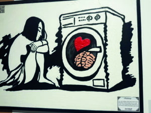 Ал көрмедегі ең терең философиялық туындылардың бірі – жасанды интеллект белгісіне жалғанған қолмен қазақтың бесігі тербеліп тұрған сурет. Бесіктің ішінде үлкен ми жатыр. Бір қарағанда, тосын көрінетін бұл композиция іштей өзіңізге сұрақ қойғызатындай. Тіпті санаңызды қытықтағандай сезім береді. Бесік – қазақ үшін тәрбие мен ұлттық сананың символы. Ал суреттегі жасанды интеллект белгісі – технология­лық дәуірдің белгісі. Автор осы екі ұғымды қатар қойып, бүгінгі ұрпақтың санасын енді ана әлдиінен бұрын цифрлық кеңістік тәрбиелеп жатқанын меңзеп тұр деп түйсіндік. Міне, осындай суреттері арқылы суретші адамзаттың рухани кеңістігіне технологияның тым ерте еніп кеткенін қалай шебер жеткізгеніне таңғалып тамсанбай тұра алмайсың.