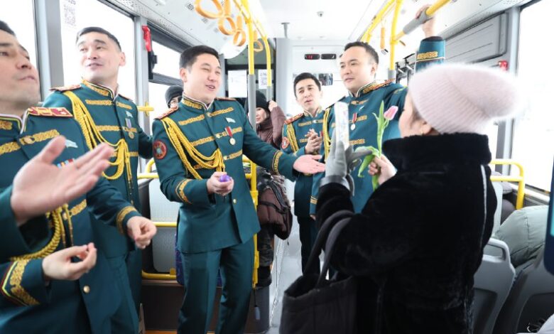 Халықаралық әйелдер күні қарсаңында ҚР ІІМ Ұлттық ұланы Ән-би ансамблінің Ерлер хорының солистері астаналық тұрғындар мен қонақтар үшін мерекелік акция ұйымдастырды. Музыкалық қойылымдар қаланың қоғамдық көліктерінде және «Нұрлы жол» вокзал кешенінде өтті, деп хабарлайды astana-akshamy.kz.